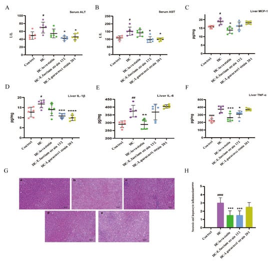 Screening strains improved liver injury in hypercholesterolemia rats. (A) The level of serum glutamic pyruvic transaminase (ALT). (B) The level of serum glutamic oxalacetic transaminase (AST). (C) The level of liver monocyte chemotactic protein-1 (MCP-1). (D) The level of liver interleukin-1β (IL-1β). (E) The level of liver interleukin-6 (IL-6). (F) The level of liver tumor necrosis factor-α (TNF-α). (G) Hematoxylin-eosin (H&E) staining of liver; (a) control group, (b) HC group, (c) HC-lovastatin group, (d) HC-E. faecium strain 132 group, (e) HC-L. paracasei strain 201 group. (H) Steatosis and hepatocyte inflammation scores. p-values were determined using a one-way ANOVA with Tukey’s test for post-hoc analysis, n = 6. Significant differences between the HC group versus control group are indicated as # p < 0.05, ## p < 0.01, #### p < 0.0001. Significant differences in the HC-lovastatin, HC-E. faecium strain 132 or HC-L. paracasei strain 201 group versus HC group are indicated as * p < 0.05, ** p < 0.01, *** p < 0.001, **** p < 0.0001.