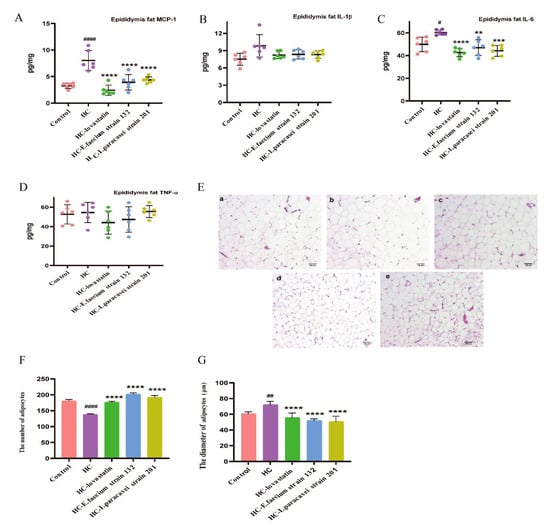 Screening strains improved the inflammation of epididymis fat and fatty hypertrophy in hypercholesterolemia rats. (A) The level of epididymis fat MCP-1. (B) The level of epididymis fat IL-1β. (C) The level of epididymis fat IL-6. (D) The level of epididymis fat TNF-α. (E) H&E staining of epididymis adipose; (a) control group, (b) HC group, (c) HC-lovastatin group, (d) HC-E. faecium strain 132 group, (e) HC-L. paracasei strain 201 group. (F) The number of adipocytes in the same field, (G) the diameter of adipocytes in the same field. p-values were determined using a one-way ANOVA with Tukey’s test for post-hoc analysis, n = 6. Significant differences between the HC group versus control group are indicated as # p < 0.05, ## p < 0.01, #### p < 0.0001. Significant differences in the HC-lovastatin, HC-E. faecium strain 132 or HC-L. paracasei strain 201 group versus HC group are indicated as ** p < 0.01, *** p < 0.001, **** p < 0.0001.