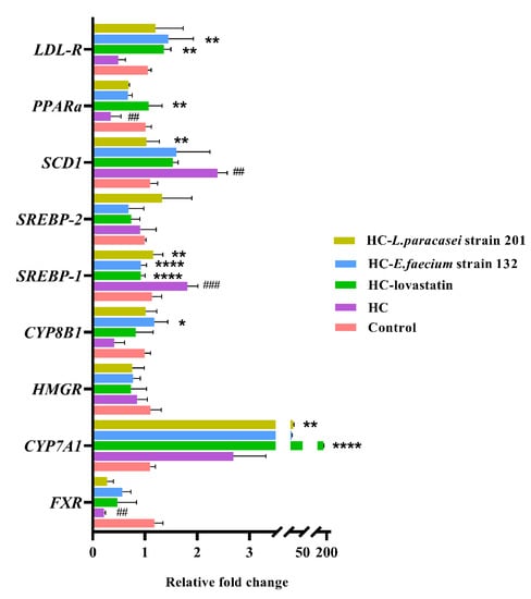 The mRNA expression levels of genes related to lipid metabolism in the liver. FXR stands for Farnesol X Receptor, and HMGR is named for 3-hydroxy-3-methyl glutaryl coenzyme A reductase. p-values were determined using a one-way ANOVA with Tukey’s test for post-hoc analysis, n = 6. Significant differences between the HC group versus control group are indicated as # p < 0.05, ## p < 0.01, ### p < 0.001. Significant differences in the HC-lovastatin, HC-E. faecium strain 132 or HC-L. paracasei strain 201 group versus HC group are indicated as * p < 0.05, ** p < 0.01, **** p < 0.0001.