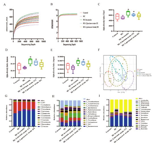 Rarefaction curve, alpha and beta diversity and the species abundance of phylum, family and genus levels. (A) Rarefaction curve based on observed_otus per sample (B) Rarefaction curve based on Shannon index per group. (C) Box plot of alpha diversity calculated by the Chao1 index. (D) Box plot of alpha diversity calculated by the Shannon index. (E) Box plot of alpha diversity calculated by the Simpson index. (F) Beta diversity calculated by Unweighted UniFrac Distance. (G) The relative abundance of phylum level. (H) The relative abundance of family level. (I) The relative abundance of genus level. The pink bar represents the control group, the purple bar represents the HC group, the green bar represents the HC-lovastatin group, the blue bar represents the HC-E. faecium strain 132 group and the yellowish-brown bar represents HC-L. paracasei strain 201group. A Kruskal–Wallis test was used to analyze the alpha diversity index, and the PERMANOVA test was used for beta diversity index analysis, n = 6. Significant differences in the HC-lovastatin, HC-E. faecium strain 132 or HC-L. paracasei strain 201 group versus HC group are indicated as * p < 0.05.