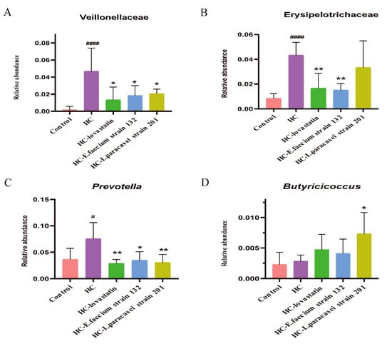 The relative abundance of Veillonellaceae, Erysipelotrichaceae, Prevotella and Butyricicoccus. (A) The relative abundance of Veillonellaceae; (B) The abundance of Erysipelotrichaceae; (C) The relative abundance of Prevotella; (D) The relative abundance of Butyricicoccus. p-values were determined using a one-way ANOVA with Tukey’s test for post-hoc analysis, n = 6. Significant differences between the HC group versus control group are indicated as # p < 0.05, #### p < 0.0001. Significant differences in the HC-lovastatin, HC-E. faecium strain 132 or HC-L. paracasei strain 201 group versus HC group are indicated as * p < 0.05, ** p < 0.01.