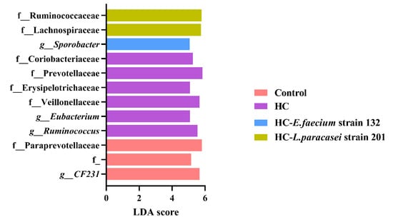 After FDR-adjustment, the abundances of Veillonellaceae, Eubacterium, Coriobacteriaceae, Erysipelotrichaceae, Prevotellaceae and Ruminococcus in the HC group were noticeably increased compared to their abundances in other groups (Figure 7). The LDA scores of CF231 and Paraprevotellaceae were significantly increased in the control group. The HC-L. paracasei strain 201 group showed a significantly higher proportion of Ruminococcaceae and Lachnospiraceae, and the abundance of Sporobacter was significantly increased in the HC-E. faecium strain 132 group (Figure 7).