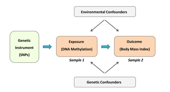 To overcome these issues, in this study, we used Mendelian randomization (MR) that can control for both confounding and reverse causation. MR is a form of instrumental variable analysis that investigates the relationship between the exposure (DNA methylation) and the outcome (BMI) using an instrument (a set of independent SNPs) that is known to cause change in the exposure. Alleles of independent SNPs are randomly allocated to offspring at conception (Mendel’s second law); therefore, an instrument of SNPs is inherently immune to the confounding effect of environmental factors that can bias an association study. Furthermore, by excluding SNPs with pleiotropic effect (Methylation ← SNP → Obesity) from the instrument, it is possible to rule out the correlation scenario, and by swapping the places of exposure and outcome and repeating the test, we can investigate the possibility of reverse causation.
