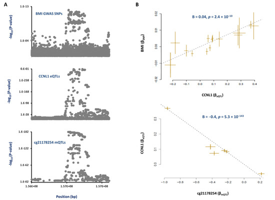 Next, we investigated whether methylation at the cg21178254 site impacts the expression of nearby genes by performing a MR analysis. Regional association plots for mQTLs of cg21178254 and eQTLs of the CCNL1 gene were found to overlap (Figure 2A). The MR analysis revealed that as this site becomes methylated, the expression of the CCNL1 gene decreases (β = −0.4, p = 5 × 10−143; Figure 2B) and this contributes to BMI (β = 0.04, p = 2 × 10−10; Figure 2B). The expression of no other gene within the 3q25 chromosome band was affected by methylation of the cg21178254 site. As such, it appears methylation at this site contributes to obesity by changing the expression of CCNL1.
