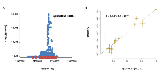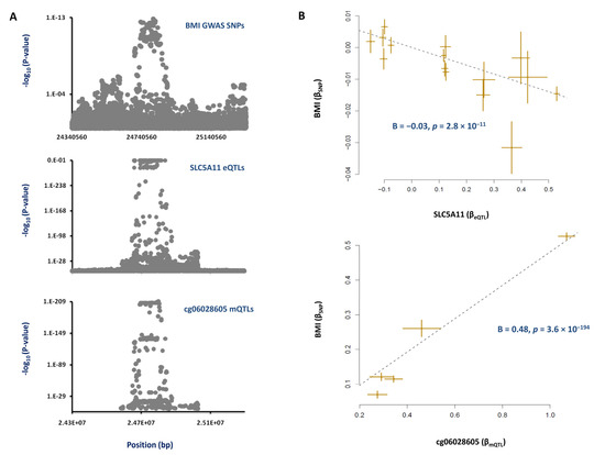 The regional association plots for mQTLs of the cg06028605 site, eQTLs of SLC5A11 and BMI risk SNPs overlap (Figure 3A). MR analysis revealed that this site contributes to the risk of obesity by changing the expression of the SLC5A11 gene. We found that, as this site becomes methylated, the expression of SLC5A11 increases (B = 0.5, p = 3.6 × 10−194, Figure 3B) and this contributes to a lower BMI (B = −0.03, p = 2.8 × 10−11, Figure 3B).