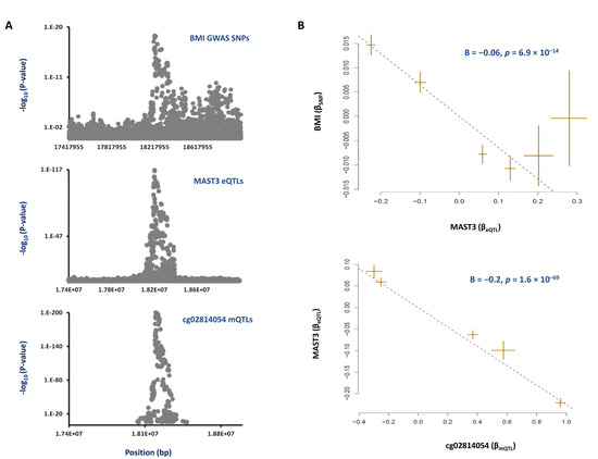 Co-localization and subsequent MR analysis revealed that the cg02814054 methylation site within MAST3 contributes to obesity. We noted that the regional association plots for cg02814054 mQTLs, MAST3 eQTLs and BMI risk SNPs overlap (Figure 4A). The top mQTL, rs4808745-T, within this region was associated with higher methylation (B = 0.96, p = 1.4 × 10−200), lower expression of MAST3 (B = −0.32, p = 2.7 × 10−269) and a higher BMI (B = 0.02, p = 7 × 10−14, Table S1). Concordantly, MR analysis revealed that, as this site becomes methylated, the expression of MAST3 decreases (B = −0.2, p = 1.6 × 10−69, Figure 4B) and the risk of obesity increases (B = −0.06, p = 6.9 × 10−14, Figure 4B).