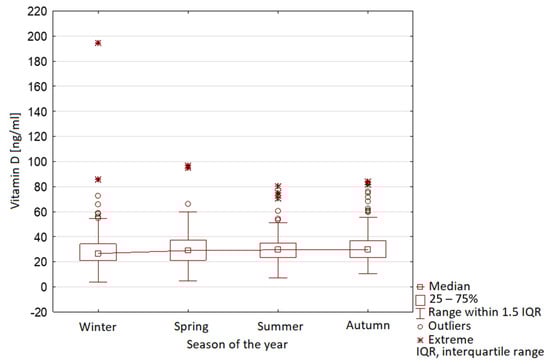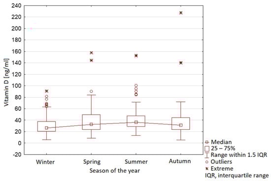 - Smyczyńska, J.; Smyczyńska, U.; Stawerska, R.; Domagalska-Nalewajek, H.; Lewiński, A.; Hilczer, M. Seasonality of Vitamin D Concentrations and the Incidence of Vitamin D Deficiency in Children and Adolescents from Central Poland. Pediatr. Endocrinol. Diabetes Metab. 2019, 25, 54–59. [Google Scholar] [CrossRef]
