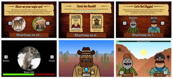 Bounty Hunter (Attentional Control). This task measures attentional control using a modified cued Go/No-Go task (GNG; [23]) comprising four blocks of 60 trials (240 total). During each trial, participants are presented with a go stimulus (i.e., bandit) they must shoot by pressing the keyboard space bar, or a no-go stimulus (i.e., sheriff) they must avoid shooting. Trials have a response window of 700 ms, with go-stimuli presented on 75% of trials. Each trial is preceded by a cue signal based on time of day to indicate upcoming stimuli (i.e., dawn indicates ‘go’ trials; dusk indicates ‘no-go’ trials). A key modification from the original cued GNG task involves stimulus onset asynchronies defined as the duration between cue and stimulus presentation [23]. Traditional cued GNG tasks have short stimulus onset asynchronies (e.g., 300 ms, 400 ms). In contrast, the current measure uses very short stimulus onset asynchronies (50 ms, 200 ms) to challenge attentional control, and long stimulus onset asynchronies (1500 ms, 3000 ms) to foster attentional disengagement, defined as withdrawal of focus from an initial target [24]. The outcome variables are reaction time (for total responses, correct responses, and commission errors), proportion of hits (detecting a go stimulus), proportion of times the no-go stimulus is hit (false alarms or commission errors), and proportion of missed go stimuli (misses).