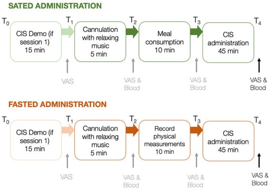 Participants first completed an online eligibility survey. Eligible participants completed two 1.5-hour laboratory testing sessions (fasting and satiety) scheduled 7–10 days apart (M = 8.6 days, SD = 1.4) at Monash University. Figure 2 summarises the procedure of both testing sessions. Sessions involved fasted or sated CIS administrations, with session order counterbalanced across participants (24 completed fasted first, 28 completed sated first).
