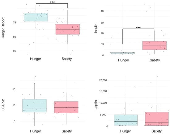 Boxplots showing the effects of hunger and satiety on subjective hunger reports, insulin (mU/L), LEAP-2 (ng/mL), leptin (pg/mL). See main text and Table S2 for statistics. *** p < 0.001.