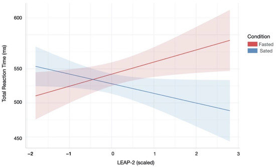 Relationship between reaction time during attentional control and LEAP-2 across hunger and satiety. Lower LEAP-2 levels during the sated condition were associated with slower reaction times overall. There were similar patterns for reaction times during correct and incorrect responses (not shown). Red/blue coloured area indicates 95% confidence interval of linear model’s predictions.