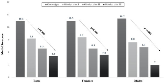 The Medi-Lite score in the study population was 9.5 ± 2.2 (median: 10, range 5–15) with slightly but not significantly higher values in males (9.6 ± 2.1) than in females (9.3 ± 2.3). Correlation analyses showed significant inverse correlations between Medi-Lite score and anthropometric measurements such as body weight (R = −0.38; p < 0.0001), BMI (R = −0.41; p < 0.0001), fat mass in kilograms (R = −0.29; p < 0.0001), fat mass in percentage (R = −0.15; p = 0.03) and waist circumference (R = −0.28; p < 0.0001).