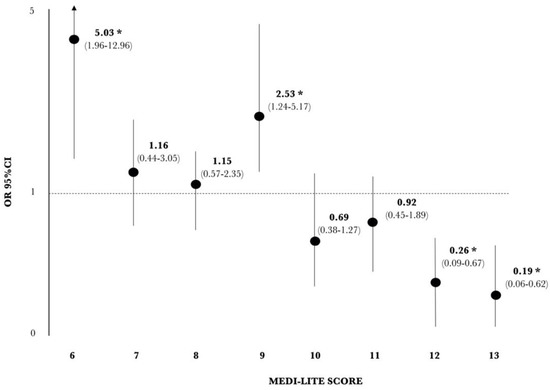 Logistic regression analysis for the risk of abdominal obesity according to the Medi-Lite score; * p < 0.05 adjusted for age and gender.