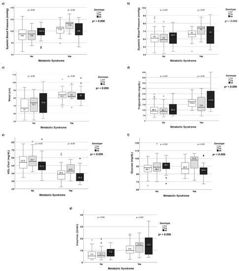 - Muñoz, A.M.; Velásquez, C.M.; Agudelo, G.M.; Uscátegui, R.M.; Estrada, A.; Patiño, F.A.; Parra, B.E.; Parra, M.V.; Bedoya, G. Examining for an association between candidate gene polymorphisms in the metabolic syndrome components on excess weight and adiposity measures in youth: A cross-sectional study. Genes Nutr. 2017, 12, 19. [Google Scholar] [CrossRef] [PubMed]