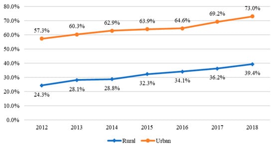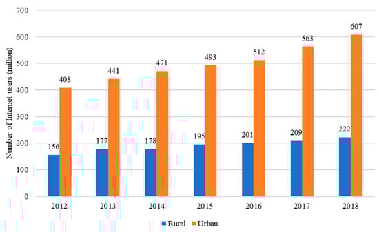 The number of internet users in rural China has rapidly increased with income growth and policy support, such as the “Broadband China” strategy implemented in 2013. Figure 1 reveals the number of rural netizens in China, which increased from 156 million in 2012 to 222 million in 2018, with an annual growth rate of 6.06% [31]. However, China’s internet market is still dominated by urban areas. In 2018, the number of urban netizens increased to 607 million [31].