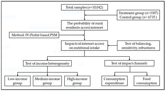 We adopted the econometric model to empirically analyze the impact of internet access on nutritional intake in Chinese rural residents. The flowchart of the study steps is shown in Figure 3. In this study, an IV-Probit-based propensity score matching method was used.