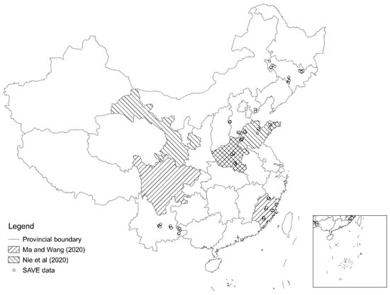 We estimated the internet effects using the 2012–2018 Survey for Agriculture and Village Economy (SAVE) data collected by the Institute of Agricultural Economics and Development (IAED), the Chinese Academy of Agricultural Sciences (CAAS). There were no ethical issues relating to the survey or our study. After data cleaning by excluding all samples that did not report their income or nutritional intake, 10,042 samples from six provinces (i.e., Hebei, Jilin, Fujian, Shandong, Henan, and Yunnan) remained (Figure 4). The data include 1445 samples from 2012, 1820 samples from 2013, 1610 samples from 2014, 1471 samples from 2015, 1494 samples from 2016, 1127 samples from 2017, and 1075 samples from 2018. Therefore, the data used in this study were unbalanced panel data.