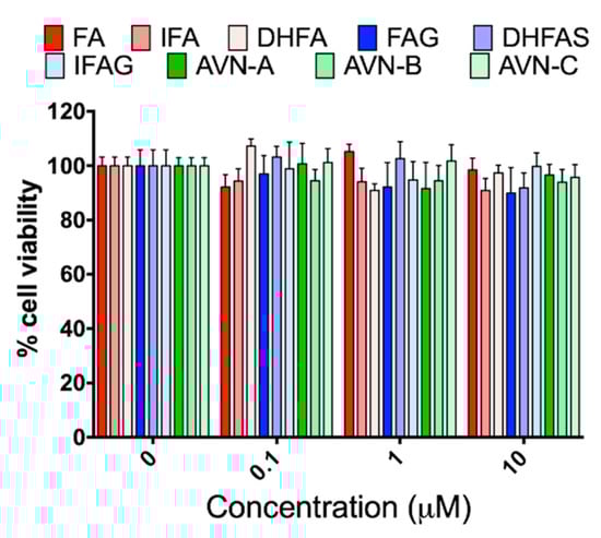 HUVEC cell viability, measured with the MTT assay, after pre-treatment with the oat phenolics and metabolites (0.1, 1 and 10 µM) ferulic acid (FA) isoferulic acid (IFA), dihydroferulic acid (DHFA), FA glucuronide (FAG), DHFA glucuronide (DHFAG), IFA sulfate (IFAS), avenanthramide A (AVN-A) avenanthramide B (AVN-B) avenanthramide C (AVN-C) for 24 h. Data are expressed as percentage of control values (100%) and reported as average ± SEM of 4 independent experiments performed in triplicate. p > 0.05 vs. control (n = 12).