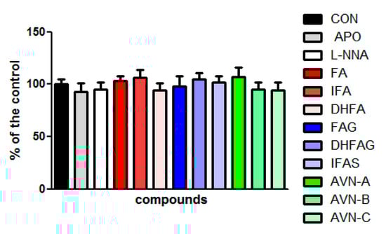 Moreover, the LDH assay was carried out to further evaluate the potential cytotoxicity of the compounds at the concentration of 1 µM and of apocynin (100 µM) and L-NNA (100 µM). The LDH assay provides an assessment of cell damage and membrane integrity. The results show that none of the compounds tested affected the cell viability (p > 0.05) (Figure 2).