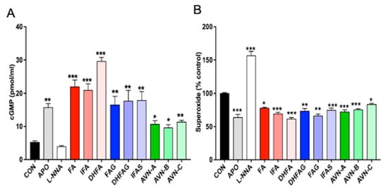 As shown in Figure 4 (panel A), the pre-treatment with apocynin led to a significant increase in cGMP levels compared to the control group (p < 0.05), whereas cells exposed to the NO synthase inhibitor L-NNA were found to have level of cGMP comparable to control cells (p > 0.05). All compounds tested at the concentration of 1 µM led to a significant increase in the cGMP levels compared to control cells. DHFA, FA and IFA proved to be the most effective in enhancing cGMP release (p < 0.001), followed by IFAS, DHFAG, FAG and AVN-C (p < 0.01), AVN-A and AVN-B (p < 0.05).