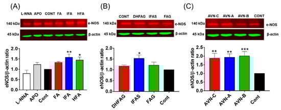 eNOS expression was also assessed through western Immunoblotting, and the protein band intensity values were normalized using the corresponding values of β-actin. The expression of eNOS (Figure 6) was significantly increased (p < 0.05) in cells pre-treated with the IFA and DHFA (Figure 6A), IFAS (Figure 6B) and AVN (Figure 6C).
