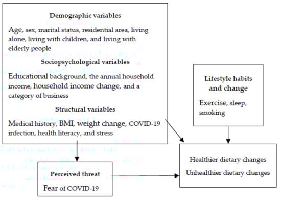 Although studies on dietary changes have been conducted worldwide, only a few studies were conducted in Japan []. Japan was one of the countries that had a less stringent governmental response to COVID-19 [,]. The Japanese government did not declare a lockdown and, instead, issued stay-at-home requests and relied on voluntary compliance. The previous studies on dietary changes since the outbreak of COVID-19 were conducted in Europe, China, and America. As the governmental responses to COVID-19 varied by country, it is necessary to investigate the dietary changes and the associated factors in Japan. To formulate future strategies to promote healthy diets during and after the COVID-19 pandemic, it is important to elucidate the factors related to dietary changes. In addition, dietary guidelines are not homogeneous across regions, and each country utilizes specific icons to describe specific food recommendations, such as a healthy eating patterns, food compositions, and food portions, through depictions that include pyramids, plates, and other illustrations []. It is necessary to develop strategies that fit the needs of the populations in different countries. Therefore, this study aimed to examine the factors related to dietary changes since the spread of COVID-19. It was hypothesized that dietary changes were influenced by demographic, sociopsychological, and structural variables and perceived threat based on the health belief model [] (Figure 1). In addition, we investigated lifestyle habits and changes, such as exercise, sleep, and smoking, which were expected to be related to dietary habits.