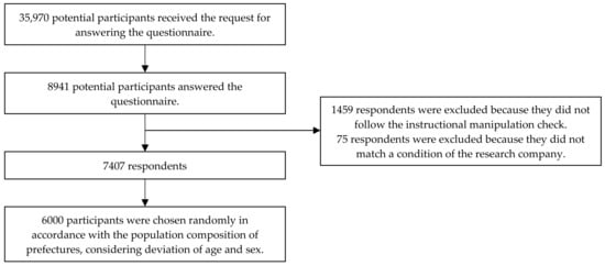 The research company delivered an invitation for participation in the questionnaire survey to 35,970 registered potential participants. Figure 2 is a flowchart of the study’s process flow and clarifies the inclusion and exclusion of participants in the study. From November 6 to 12, 2020, 8941 registered potential participants answered the questionnaire. The questionnaire informed the potential participants that the survey was for research purposes and that they could refuse to answer any question. After providing voluntary consent to participate, the participants answered the questionnaire. Among the 8941 respondents, 7482 respondents followed the instructional manipulation check, which detects participants who are not following instructions, and 1459 respondents did not follow it and excluded, thereby improves the quality of survey responses. This method was validated by previous studies [,]. Seventy-five respondents were excluded from these 7482 respondents because the research company judged that they did not answer the questionnaire accurately. Subsequently, 6000 participants were chosen randomly from the 7407 respondents in accordance with the population composition of prefectures [], considering deviations of age and sex. This study was approved by the Ethics Committee of the University of Nagano (authorization number: E20-3).