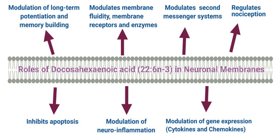 The brain is known as the body’s fattiest organ, containing phospholipids around 2/3 of its weight. The brain harness 20% of its total energy from β-oxidation of fatty acids in the mitochondria of astrocytes. The presence of DHA on the membrane influences neuronal information transmission, signal transduction velocity, and interaction with ion channels or receptor proteins and their activity [102]. DHA is also predominantly present in cortical gray matter, representing approximately 15% of total fatty acids in the adult human prefrontal cortex. As a crucial structural ingredient of the brain, DHA comprises the regions of the cerebral cortex and synaptic membrane. Neuronal membranes have approximately 50% DHA [44]. DHA is also vital for hippocampal and cortical neurogenesis, neuronal migration, and outgrowth [93,103,104].