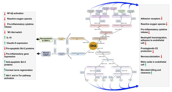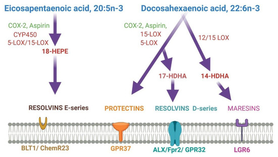 DHA-derived specialized pro-resolving mediators (SPMs) such as DHA epoxides, oxo-derivatives (EFOX) of DHA, neuroprostanes, ethanolamines, acylglycerols, docosahexaenoyl amides of amino acids, and branched DHA esters of hydroxy fatty acids play important roles in brain functions [131,132]. Additionally, epoxydocosapentaenoic acids (EDPs) and 22-hydroxydocosahexaenoic acids (22-HDoHEs) are produced from DHA [133,134]. DHA is mainly metabolized by enzymes such as 5-, 12- and 15-lipoxygenases (LOX), COX-2, and cytochrome P450 (CYP). As the most demanding by-products of DHA, resolvins are formed by either LOX15 or CYP or aspirin-treated COX-2 activity [28]. The LOX15-derived resolvins are homologous to CYP-, or aspirin-treated COX-2-derived resolvins [28]. As the inflammation resolution mediators, resolvins act via different G-protein coupled receptors (GPRs) [28,135]. Both resolvin D1 and aspirin-triggered resolvin D1 improve brain functions and impede neuronal death by down-regulating several factors such as NFkB, TLR4, CD200, and IL6R [136,137]. They even induce remote functional recovery after brain damage [136]. Both resolvin D2 and aspirin-triggered resolvin D2 protect from cerebral ischemic injury via phosphorylation ERK1/2. Subsequently, this pathway stimulates nNOS or eNOS to inhibit neuronal cell death and maintain BBB integrity by increasing zonula occludens-1 [138]. Resolvin D3, resolvin D5, aspirin-triggered COX-2 -derived resolvin D3, and aspirin-triggered resolvin D5 halt the neuroinflammation [139,140]. However, the functions of other resolvins are still a mystery. Maresin (MaR), the anti-inflammatory pro-resolving mediator, is produced from DHA in macrophages during the inflammation, healing, and regeneration process [141,142,143]. MaR1 is predominant among other maresins. MaR1 decreases LTB4 synthesis and stimulates phagocytosis at the site of inflammation [144,145,146]. MaR1 enhances tissue repair by stimulating stem cell differentiation and plays an analgesic role through TRPV1-mediated response blockage [145,147]. MaR1 involves neurocognitive functions by regulating the infiltration of macrophages, regulating NF-κB signaling, oxidative stress, and cytokine release. Maresin 1 reduces neuroinflammation perioperative neurodegenerative disorders in an animal model [148]. MaR1 significantly affects the post-spinal cord injury model [149,150].