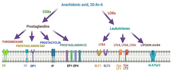 The most abundant prostaglandins in the brain are PGD2 and PGE2. They are synthesized from ARA by PGD2 and PGE2 synthases. COX-2 is overexpressed in the cortex and hippocampus of Alzheimer’s disease patients [259]. PGE2 increases neuroinflammation and amplifies Alzheimer’s disease pathology through various mechanisms.
