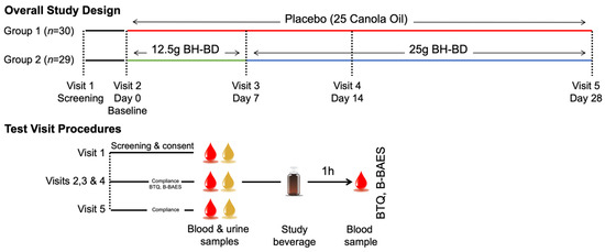 We conducted a randomized, double-blind, placebo-controlled, parallel study in healthy adults to evaluate the tolerability and safety of BH-BD compared to placebo (Figure 2). Subjects consumed one daily serving of BH-BD or a taste-matched placebo that contained an identical mass of non-ketogenic fat (canola oil) formulated into a 75 mL beverage, along with breakfast for 28 days. Subjects completed a Beverage Tolerability Questionnaire (BTQ) and the Brief Biphasic Alcohol Effect Scale (B-BAES) before and after consuming the study beverage each day to assess the effects of the study beverage. An institutional review board (IntegReview IRB, Austin, TX, USA, 8 December 2020, BIO-2103) approved all study related material including the protocol and informed consent documents prior to initiation of the study. Signed informed consent and authorization for use of protected health information was provided by the participants prior to implementing any protocol-specific procedures. The study was registered in the clinicaltrials.gov database as NCT04707989 and this analysis focused on BH-BD vs placebo outcomes. The study was conducted in accordance with Good Clinical Practice Guidelines, the Declaration of Helsinki [37] and United State Code of Federal Regulation Title 21. Studies took place at Biofortis Research (Addison, IL, USA) between December 2020–February 2021.