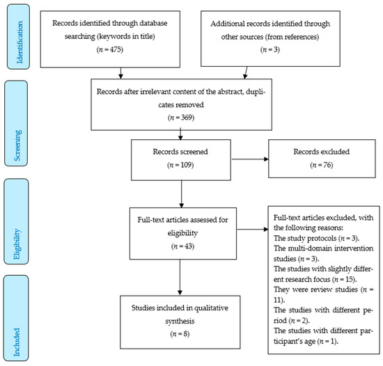 - The review studies [10,16,17,18], slightly different research focus [19], multi-domain intervention studies [9,20,21], study protocols [22,23], the studies outside the determined period [11,12] or the studies with different age of participants [24].