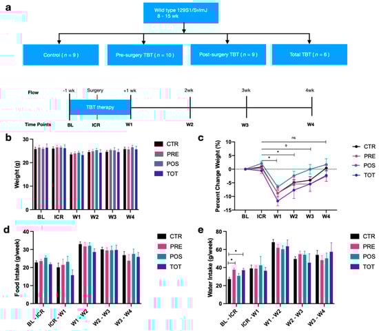The four intervention groups were control (CTR), preoperative TBT supplementation (PRE), postoperative TBT supplementation (POS), and combined pre- and postoperative supplementation (TOT) (Figure 1a). PRE mice received one week of preoperative TBT followed by ICR, POS mice received ICR followed by one week of postoperative TBT, and TOT mice received one week of preoperative TBT followed by ICR and an additional one week of postoperative TBT. CTR mice received surgery but no TBT supplementation.