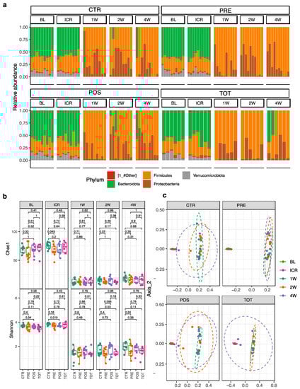 Difference in microbial abundance at the phylum level along changes in alpha and beta diversity from BL to W4. (a) Phylum-level differences in relative microbial abundance between groups over time. (b) Within- and between- group changes in α-diversity using Chao1 and Shannon indices. (c) Between-group differences from baseline to week 4 in β-diversity using weighted UniFrac analysis.