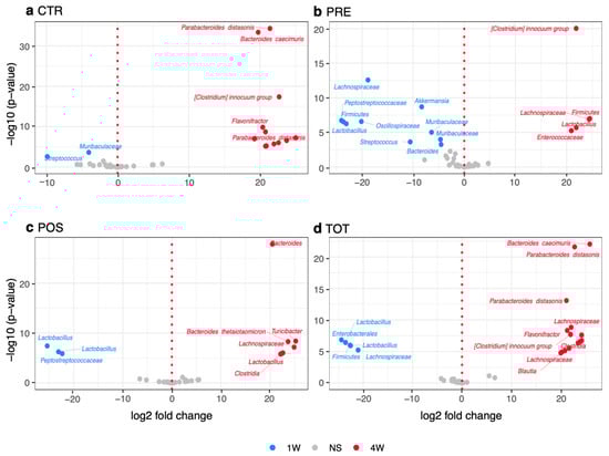 Volcano plots demonstrating significant differences (p adj. < 0.05) in relative abundance of microbial taxa from W1 to W4. (a) CTR group volcano plot. (b) PRE group. (c) POS group volcano plot. (d) TOT group volcano plot. NS represents values that are not significant.