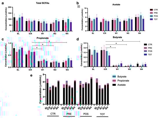 Concentrations of fecal short-chain fatty acids (SCFAs) from BL to W4 by intervention group. Column graphs represent median +/− SEM. (a) Total SCFAs. (b) Acetate. (c) Propionate. (d) Butyrate. (e) Proportion of SCFAs. * represents p < 0.05.