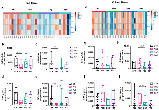 Tissue-weight-adjusted cytokine concentrations in perianastomotic ileal and colonic tissue homogenate. Box-and-whisker plots represent the distribution of each group at W4. The median is represented by the middle line while the upper and lower borders of the box plot identify the 75th and 25th percentile, respectively. The whiskers correspond to the maximal and minimal values. (a) Heatmap of ileal tissue cytokine concentrations after logarithmic transformation of data. (b–e) Concentration of IL-1 β, IL-6, IL-10, and TNF-α, respectively, per gram of dry ileal tissue. (f) Heatmap of colonic tissue cytokine concentrations after logarithmic transformation of data. (g–j) Concentration of IL-1 β, IL-6, IL-10, and TNF-α, respectively, per gram of dry colonic tissue.