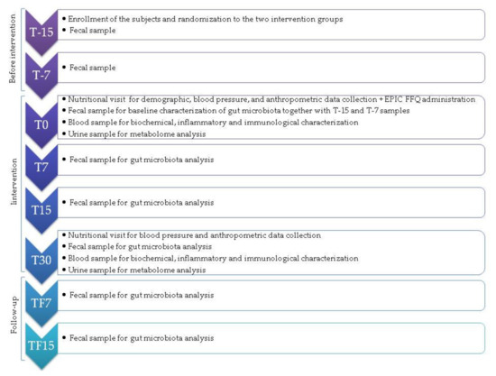 The study lasted 30 days, with a 15-day follow-up (TF). Fecal samples were collected weekly in the two-week run-in period for a more reliable depiction of the basal microbiota configuration. Biological sample collection and anthropometric, biochemical and immunological measurements were performed at multiple time points as shown. Dietary habits were assessed at baseline using a validated food frequency questionnaire (see Figure 1 for more details).