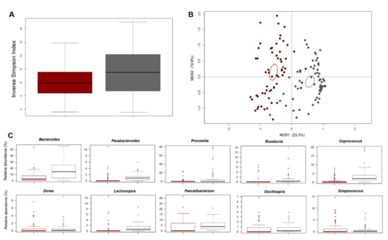 The gut microbiota of study subjects at risk for metabolic syndrome segregated from those of healthy Italian controls, matched by microbiota-associated confounding factors (i.e., age and gender). (A) Boxplots showing the distribution of alpha diversity, according to the inverse Simpson index, in study subjects (dark red) compared to healthy Italian controls (grey). A significantly reduced diversity was observed in the former group (p = 0.01, Wilcoxon test). (B) PCoA plot of beta diversity, based on Bray–Curtis dissimilarity between the genus-level microbial profiles. A significant separation between study subjects and healthy Italian controls was found (p = 0.001, permutation test with pseudo-F ratio). Samples are identified with colored dots as in (A). Ellipses include 95% confidence area based on the standard error of the weighted average of sample coordinates (dark red, subjects at risk for metabolic syndrome; grey, healthy controls). (C) Boxplots showing the relative abundance distribution of differentially represented genera between study subjects and healthy Italian controls (p ≤ 0.05, Wilcoxon test).