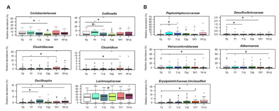 As for the PROB-group, apart from the reduction in the proportions of Desulfovibrionaceae (T0 vs. T15 and T0 vs. TF7, p = 0.04, Wilcoxon test), we observed some unfavorable changes, including the increase in pro-inflammatory taxa, such as Peptostreptococcaceae (T0 vs. T15, p = 0.02) and unclassified Erysipelotrichaceae members (T0 vs. TF7, p = 0.02), and the decrease in the metabolic health-associated genus, Akkermansia (T0 vs. TF15, p = 0.04) (Figure 3B). Again, these taxa showed no significant changes in the 2 weeks prior to intervention (p > 0.05, Friedman test) (data not shown).