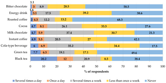 Black tea was the most frequently chosen source of caffeine in the diet. It was drunk by 20.2% of the respondents daily. Bitter chocolate, which was eaten by only 1% of respondents daily, was the least frequently chosen product (Figure 1).