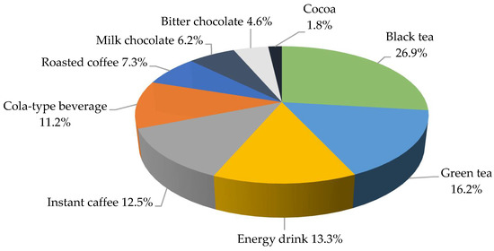 Caffeine is one of the best-described stimulants in the world and the products that are its source in the diet are equally popular among adults and younger age groups [1]. Recent studies have confirmed the safety of coffee consumption by adults, consumed in the form of hot drinks [1,2]. Many studies have shown that coffee may, among others, reduce the risk of type 2 diabetes and liver cancer, uterine or prostate cancer, and basal cell carcinoma. It was also shown to reduce the risk of neurological and cardiovascular diseases [3]. Drinking coffee in the amount of 3–4 cups a day was also associated with reduced mortality in a group of women and men in the HAPIEE study [4]. However, the safety of caffeine, which is the main stimulant present in coffee, depends on individual characteristics, such as body weight, gender, physiological condition or the dose consumed [1,5]. Caffeine occurs naturally in coffee, tea or chocolate [6]. Synthetic caffeine is found in many products that are used to eliminate sleepiness and provide psychophysical energy [7]. The sources of caffeine in the diet do not only include drinks such as coffee or tea, drugs and dietary supplements, but also energy drinks or chocolate, popular among the youth [6,7]. The safety of caffeine used by adolescents is constantly studied, and establishing its safe level of consumption in children and adolescents is difficult to achieve [1,5,7]. Some recent reports on caffeine safety presented by the European Food Safety Authority (EFSA) [5] are slightly more restrictive in relation to the 2003 report published by Nawrot et al. [8]. A new study by Temple et al. revealed that caffeine consumption was associated with risky behaviors undertaken by children and adolescents, regardless of gender [9], as well as the increased consumption of sweet soft drinks among girls [10]. Caffeine consumption by adolescents is also associated with sleep disorders, which may lead to learning and concentration difficulties, or even an increased risk of obesity [11]. In Kim’s study, higher caffeine intake was also associated with lower nutritional knowledge and knowledge about the effects of caffeine on bones and sleep disorders [12]. According to the NHANES study, children who watched TV more than two hours a day were characterized by a significantly higher caffeine intake [13]. The most common side effects of the consumption of caffeinated products or beverages include insomnia, frequent urination, excitement or anxiety, and headaches [14,15]. Therefore, it is necessary to conduct further research into the assessment of caffeine consumption and dietary intake in children and adolescents.