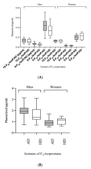 The present study demonstrates for the first time that the consumption of HD decreases the total level of F2-IsoP, 5-F2t-IsoP, and 8-F2t-IsoP compared to consumption of AD. Specifically, the 5-F2t-IsoP and 8-F2t-IsoP were reduced by HD intake. Most previous studies investigated only the 15-F2t-IsoP. Moreover, 15-F2t-IsoP was positively correlated with FBG after AD consumption. These results also demonstrate the need to assess several isomers of F2-IsoP to obtain an overview of oxidative effects. The specific isomers affected can differ with pathologies. The previous study showed that 5-F2t-IsoP/5-epi-F2t-IsoP were associated with hypertension during pregnancy and proteinuria [23], while 15-epi-15-F2t-IsoP was associated with diabetes in pregnancy [24]. Moreover, plasma levels of F2-IsoP were lower among women compared to men after HD consumption compared to AD.