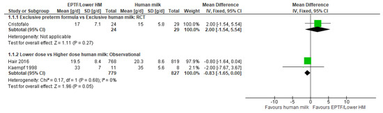 Observational studies: Two studies reported weight gain in g/d and were included in a meta-analysis [36,48] with a possible difference between lower and higher doses of HM (MD −0.83, 95% CI −1.65 to 0.00, n = 1606, I2 = 0%, Figure 1, low certainty evidence, Table S2).