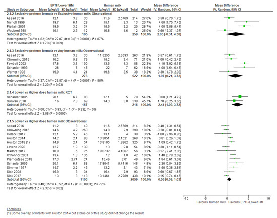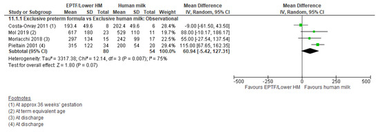 Observational studies: Six studies reported weight gain in g/kg/d with five included in the meta-analysis [9,19,39,47,64]. EPTF-fed infants had a higher rate of weight gain (MD 1.97, 95% CI 0.21 to 3.72, n = 795, I2 = 85%, Figure 2, very low certainty evidence, Table S3). Heterogeneity may be explained by baseline difference in the study duration and varying intake of HM. Carlson 1998 [45] assessed weight gain over different time periods and showed higher weight gain (g/kg/d) in infants receiving EPTF compared with any HM over the time period 15–35 days and 57 days to term (Table S1).