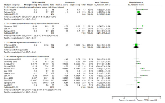 Change in z-scores was reported in three studies [22,47,63] and all were included in a meta-analysis. There was no clear difference in change in z-score between infants receiving EPTF and any HM (MD 0.21, 95% CI 0.15 to 0.56, n = 1532, I2 = 82%, Figure 3, very low certainty evidence, Table S4). Heterogeneity may be due to the varying doses of HM (Table 1).