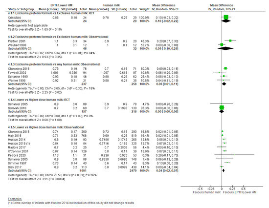 Observational studies: Twelve studies reported HC growth in cm/wk with 10 included in the meta-analysis [20,28,29,33,47,48,52,56,59,61] showing greater HC gain associated with lower-dose HM (MD 0.04, 95% CI 0.02 to 0.07, n = 4080, I2 = 56%, Figure 4, very low certainty evidence, Table S5).