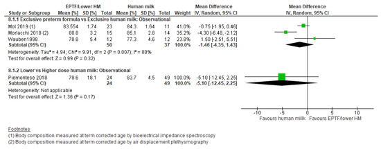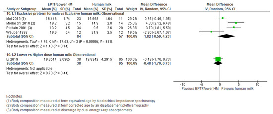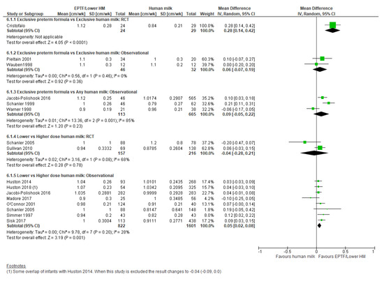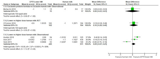One study reported change in HC z-scores [55] and showed no clear difference between the EPTF and EHM fed groups (MD 0.10, 95% CI −0.42 to 0.62, n = 32, Figure 5, low risk of bias, Table S6).