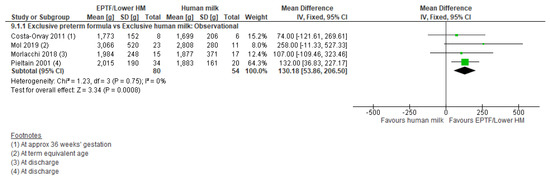 Randomised Trials: One small RCT [31] showed no difference in weight gain (g/d) between EPTF and EHM groups (MD 2.00, 95% CI −1.54 to 5.54, n = 53, Figure 1, moderate risk of bias, Table S2).