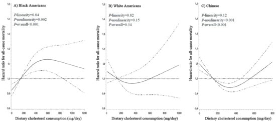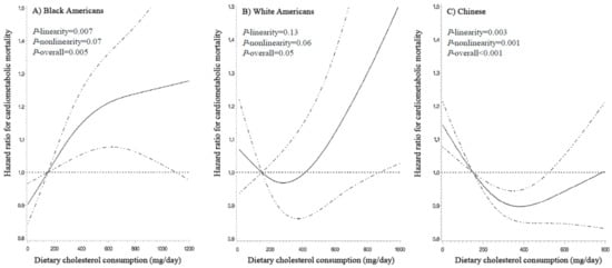 The pool of cholesterol in the body is determined by the balance among de novo synthesis, dietary intake, absorption, metabolism, enterohepatic recirculation, and excretion []. The divergent associations of dietary cholesterol with cardiometabolic mortality may be linked to different cholesterol intake levels and food sources across ethnicities. In the current study, intakes of overall cholesterol and non-egg cholesterol were higher in Black Americans than in White Americans and Chinese, as consistently found in national surveys in the US (320 mg/day in non-Hispanic Blacks and 282 mg/day in non-Hispanic Whites in 2013–2014) [] and China (266 mg/day in 2011) []. Some non-egg cholesterol sources, such as red and processed meat, are also sources of saturated fat and sodium, which may confound the association between cholesterol intake and cardiometabolic risk []. However, our results remained consistent after further controlling for saturated fat intake and other nutrients such as carbohydrates and sodium or major cholesterol-containing foods. Still, we cannot rule out the possibility of residual confounding due to imperfect dietary measures. Nevertheless, dietary cholesterol intake only slightly increases serum cholesterol levels, as supported by findings from a meta-analysis of 17 trials that 100 mg/day cholesterol intake only increased total cholesterol by 0.056 mmol/L and low-density lipoprotein cholesterol by 0.050 mmol/L []. Besides dietary intake, it is also uncertain whether cholesterol absorption and de novo synthesis, which are largely genetically determined [], are different across ethnicities; future feeding studies including multi-ethnic participants are needed. In addition, our Black and White participants were mostly from low-income communities, with the majority having an annual household income ≤ 15,000 USD. The risk profile, e.g., low socioeconomic status, unhealthy lifestyles (e.g., current smoking and heavy drinking), and underlying metabolic risk factors (e.g., hypertension and diabetes), in this disadvantaged American population were vastly different from those in urban Chinese, which may confound and modify the associations between dietary cholesterol and mortality []. It is likely that the different risk profiles across ethnicities may partly account for the differential associations observed in our study.